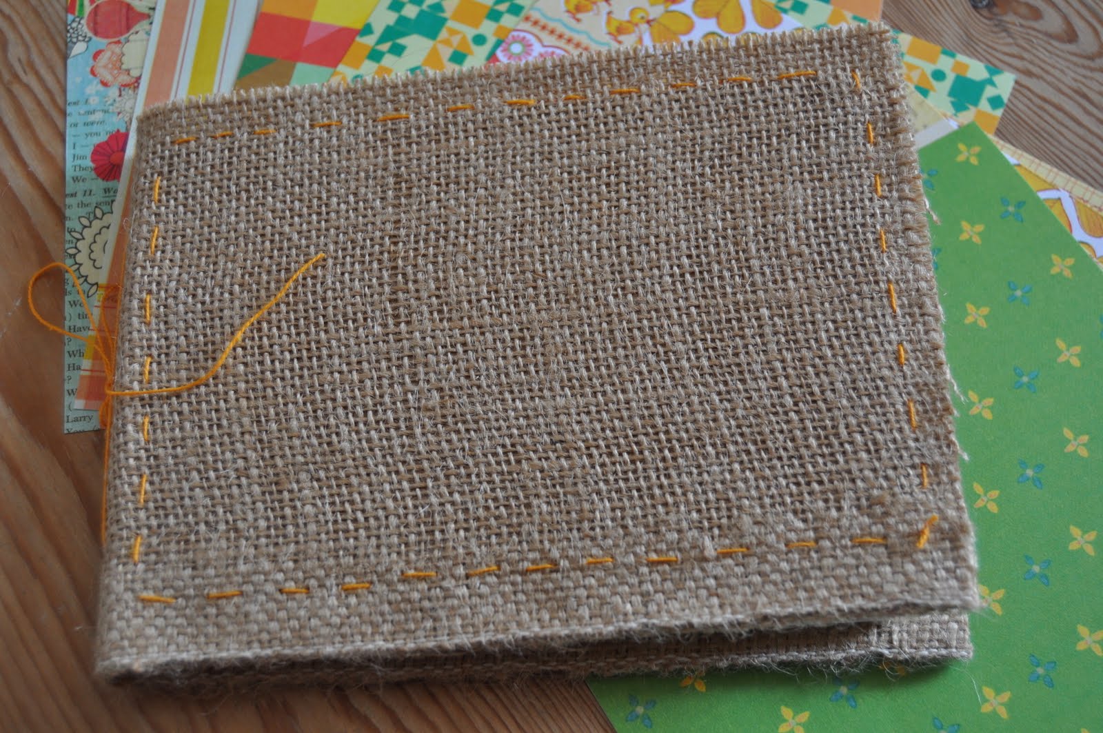 Jeg har taget noget pap og beklædt det med hessian, som har fået en syning med orange tråd hele vejen rundt. Siderne inden i er sat fast med en syning i ryggen. Så har jeg fundet noget papir frem, som jeg tror, at jeg vil bruge.